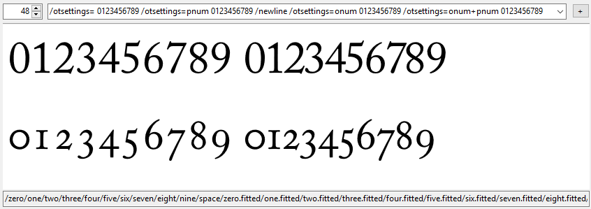 The preview text allows you to enable and disable features for subsequent text. This allows you to test several feature combinations at once, so for example you can compare how small capitals behave with and without kerning applied. It also allows you to compare the way lining and oldstyle figures work with tnum or pnum enabled.