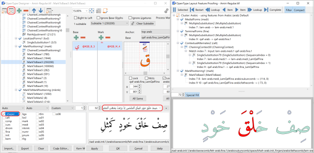 It uses the preview text and selected script, language, and features as defined in the OpenType Designer window, but the proofing window allows you to see exactly what features, lookups, and specific items have been applied to turn your original input into the visual appearance as shown in the preview area.
