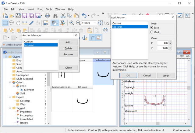 When you are satisfied with the result, click the Convert to contours button. You might want to change the right side-bearing by clicking and dragging the right-most vertical dotted line. While we are still in the Glyph Edit window, we open the Anchor Manager (available from the Font menu) and add a new anchor class named top-arab. This class can now be used to define top anchor marks to position marks on base glyphs.