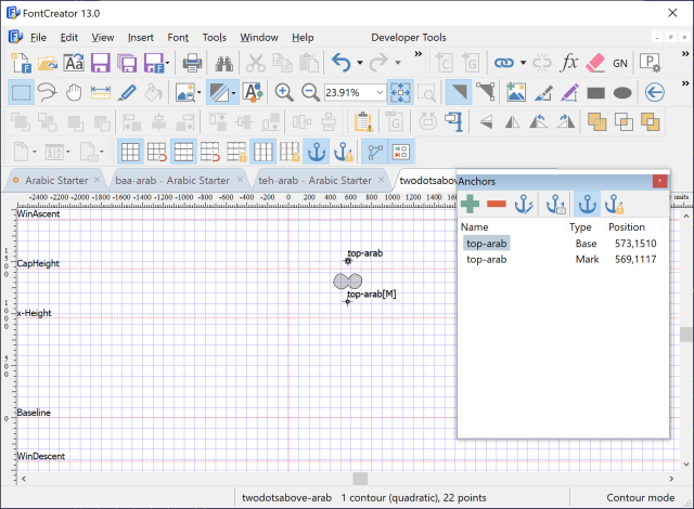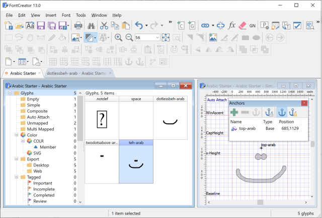 Since most Arabic letters come in all four forms, there are a lot of characters and glyphs needed. Fortunately, numerous glyphs can make use of outlines from other glyphs, and FontCreator can help generate them using composite glyphs and anchors.