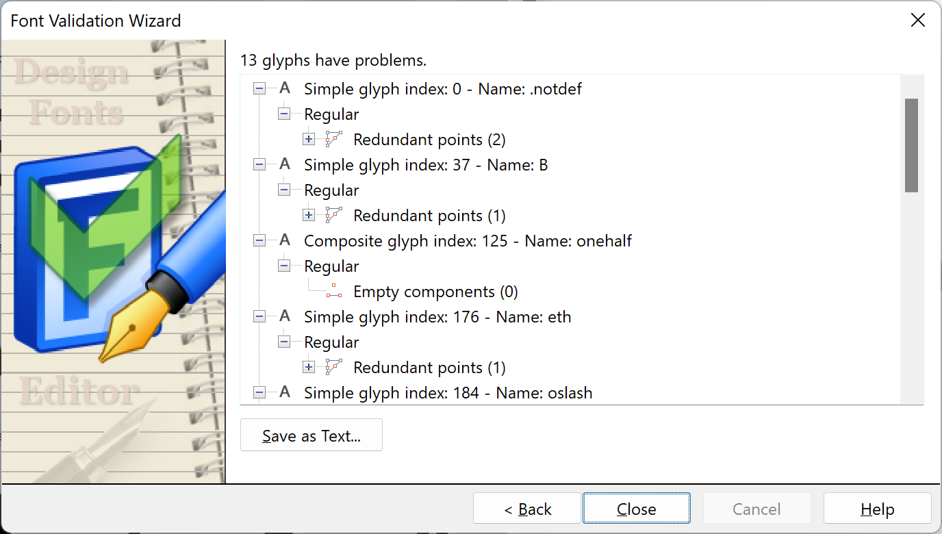 After the validation process the (remaining) problems are shown for all glyphs. Optionally the report can be saved.