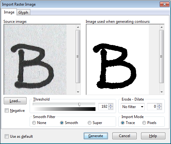 When the Import Mode is set to Trace, the image will be converted with curves. This is the recommended setting. In case you don’t want curves (especially useful for bar code fonts and pixel fonts), set the Import Mode to Pixels.