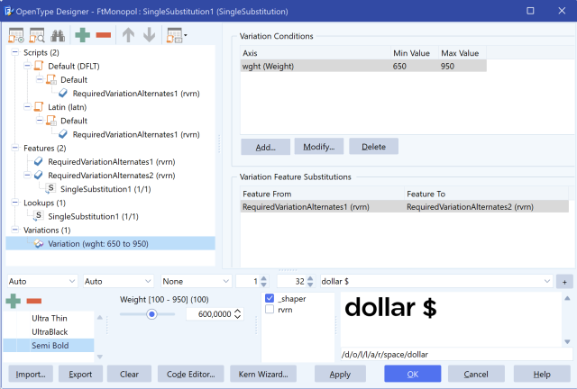 Imagine a scenario where you want a dollar sign with a single vertical stroke to switch to an alternative design with a broken bar, suitable for bolder weights (e.g., when the weight axis is 650 or more). This is where OpenType's feature variations come into play.