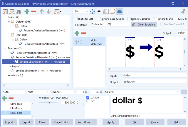 - Name this lookup "SingleSubstitution1" and configure it to substitute the regular dollar sign with the alternative glyph.