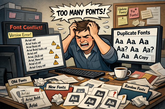 Over the years, your font collection can quietly grow into a mix of multiple versions of the same typeface, coming from downloads from different sources, older backups, updated releases, Windows updates, and shared project folders. While Windows won’t typically install true duplicates side-by-side, those extra files can still live in your font library and folders. MainType helps you spot outdated versions and clean up your library so you keep only the best font files.