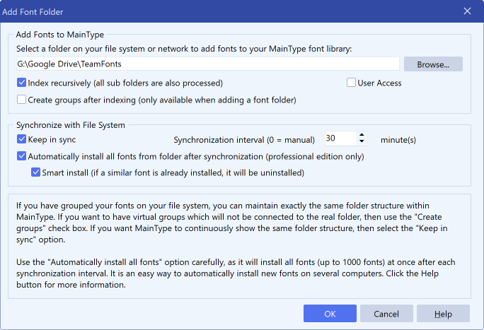 • Synchronization Interval – Set how often MainType refreshes the folder (0 = manual only).
