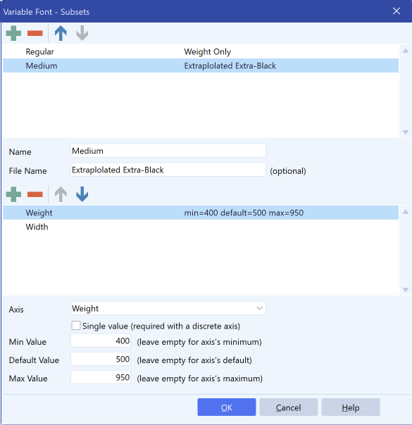 Another useful feature in FontCreator is the ability to set new defaults for each axis. If you want to change the default instance of a font—say, make the medium weight (500) the default instead of the regular weight (400)—you can do this directly in the Subset window.